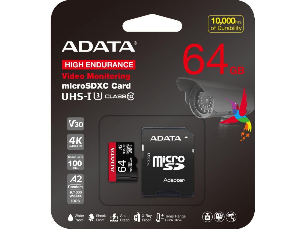 Karta microSD Adata High Endurance 64 GB je navrhnutá tak, aby vyhovovala najnáročnejším aplikáciám. Je ideálna pre zariadenia, ktoré vyžadujú nepretržité nahrávanie, ako sú napríklad sledovacie kamery a záznamové zariadenia do vozidiel. Vďaka svojej konštrukcii odoláva extrémnym podmienkam prostredia, takže je ideálna pre náročné situácie, v ktorých by iné karty mohli zlyhať. Jej schopnosť prežiť extrémne teploty, odolnosť voči vode, nárazom a röntgenovému žiareniu zaručuje bezpečnosť a spoľahlivosť vašich dôležitých údajov.