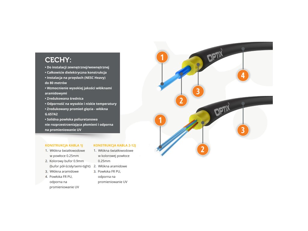 Univerzálne (vonkajšie/vnútorné) kruhové samonosné káble na použitie v systémoch FTTx vystužené aramidovými vláknami (nosný prvok v nadzemných inštaláciách), ľahká konštrukcia s malým priemerom ~ 3 mm vysoká pružnosť a odolnosť proti preťahovaniu, PU plášť, povlak odolný proti UV žiareniu, plne dielektrický, pevnosť v ťahu pri inštalácii 800N teplotný rozsah od -20...+70 [°C]