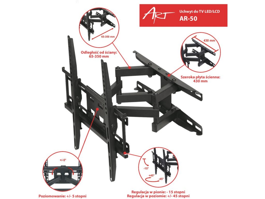 Držiak AR-50 ART je určený na montáž jedna televízia s uhlopriečkou obrazovky 23 až 60 palcov . Maximálna hmotnosť zariadenia, ktorú môže rukoväť uniesť, je 45 kg .