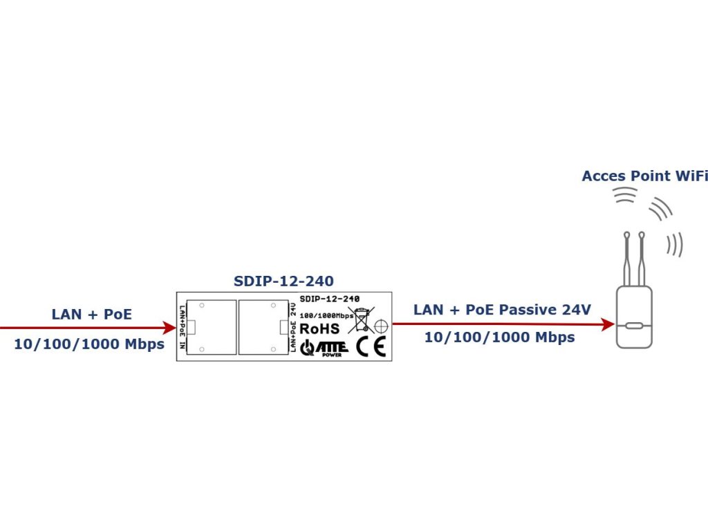 SDIP-12-240 je gigabitový adaptér PoE s konvertorom na zníženie napätia. Zariadenie umožňuje zmenu napájania z PoE 802.3af alebo PoE PASSIVE (35...56V) na PoE PASSIVE 24V.