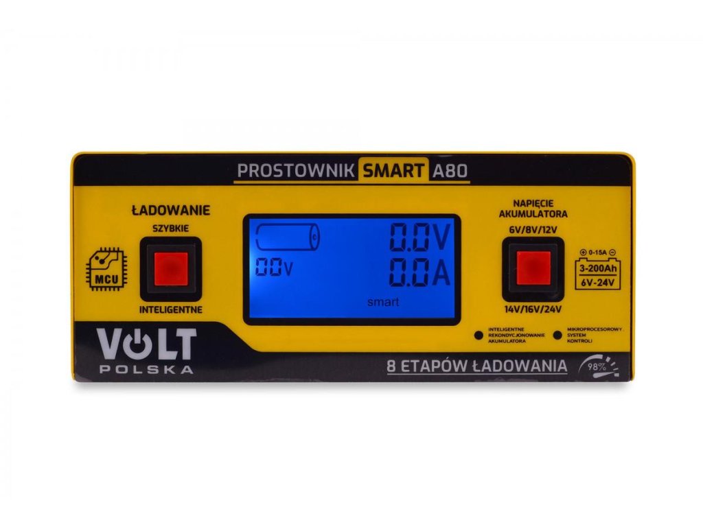 Nabíjačka SMART 6V/12V/24V15A A80 je prvá nabíjačka batérií na trhu s mikroprocesorovým riadiacim a kontrolným systémom PWM s možnosťou nabíjania batérií až do 24 V a s možnosťou výberu neštandardných typov napätia batérií. Vďaka inteligentnému nastaveniu parametrov umožňuje regeneráciu vybitej batérie.