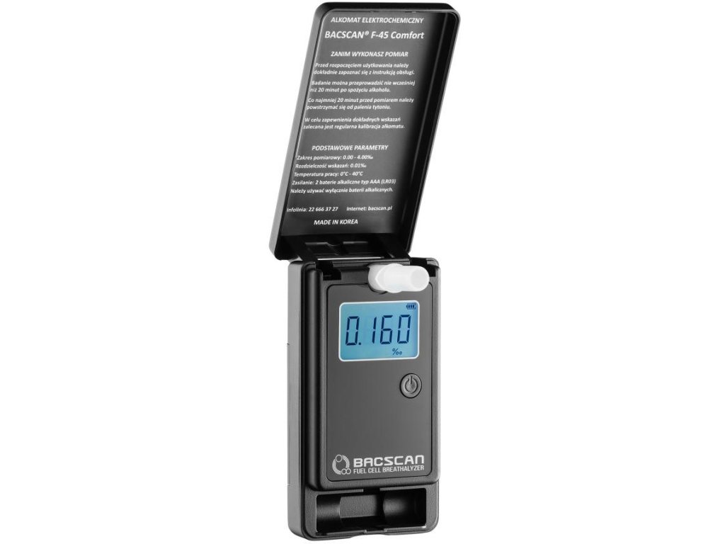 F45 Comfort bol z výroby integrovaný do krytu, ktorý poskytuje dodatočnú ochranu zariadenia. Dychový analyzátor je vybavený snímačom prúdenia vzduchu, ktorý zaručuje správne testovanie. Tester má tiež počítadlo všetkých vykonaných meraní a funkciu pripomienkovania kalibrácie, ako aj pamäť na posledných 10 výsledkov. Výhodou prístroja je držiak náustku na prednom paneli, ktorý uľahčuje meranie, a zabudovaný úložný priestor na náustok. Dychový analyzátor má tiež možnosť preddefinovať jednotky merania podľa požiadaviek používateľa (‰, mg/l, % BAC)*.