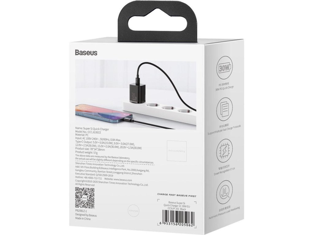 - Baseus Super Si 1C USB-C 30W Power Delivery Quick Charge CCSUP-J01 sa vyznačuje vysokou kompatibilitou s celým radom smartfónov a tabletov a široký rozsah striedavého napätia 100-240 V umožňuje jeho použitie takmer kdekoľvek na svete.