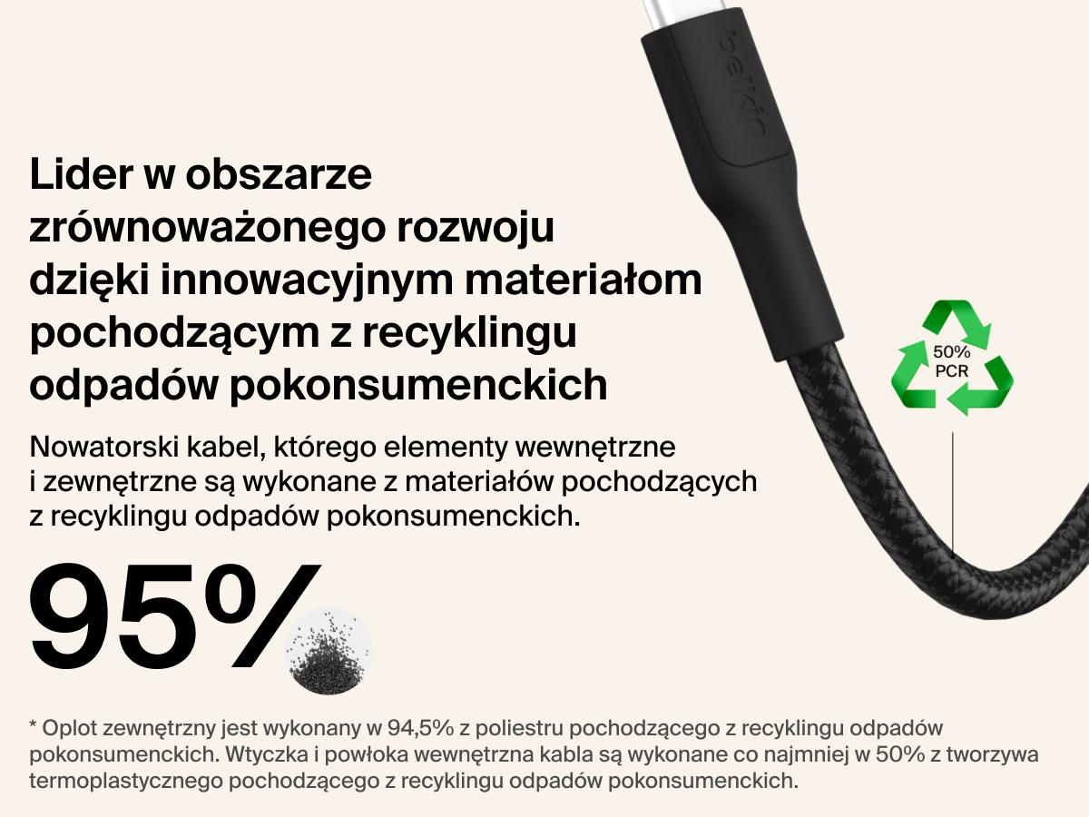 - Belkin Green: Plášť kábla je vyrobený z 95 % z recyklovaných materiálov a vnútro z 50 % z recyklovaných materiálov.