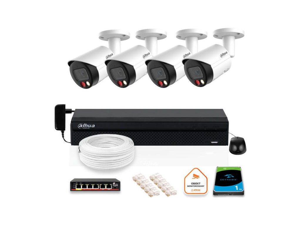 - Ponúkaná súprava videodohľadu pozostáva z4-kanálový rekordér s 1 TB pevným diskom,sada 8Mpx IP kamery a príslušenstvana zabezpečenie správneho fungovania systému.