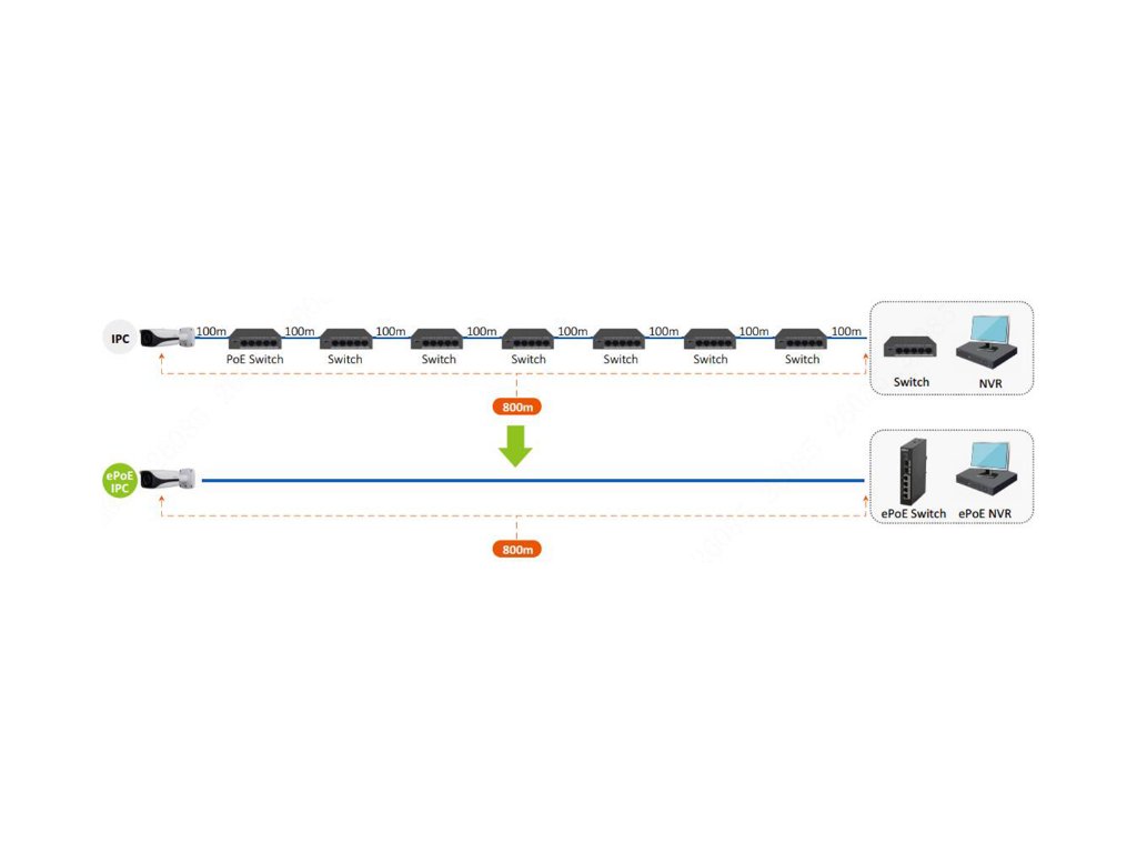 Technológia Dahua ePoE poskytuje prenos na dlhé vzdialenosti napájanie, video, audio a riadiace signály cez 800 metrov pri rýchlosti 10 Mb/s alebo 300 metrov pri rýchlosti 100 Mb/s prostredníctvom kábel (krútená dvojlinka) Kategória 5 alebo koaxiálny kábel vďaka použitiu modernej modulácie kódovania 2D-PAM3. Technológia Dahua ePoE ponúka nový spôsob realizácie diaľkového prenosu medzi IP kamerami a sieťovými prepínačmi. Umožňuje flexibilnejší návrh monitorovacieho systému, zvyšuje spoľahlivosť a šetrí náklady na budovanie dodatočnej kabeláže.