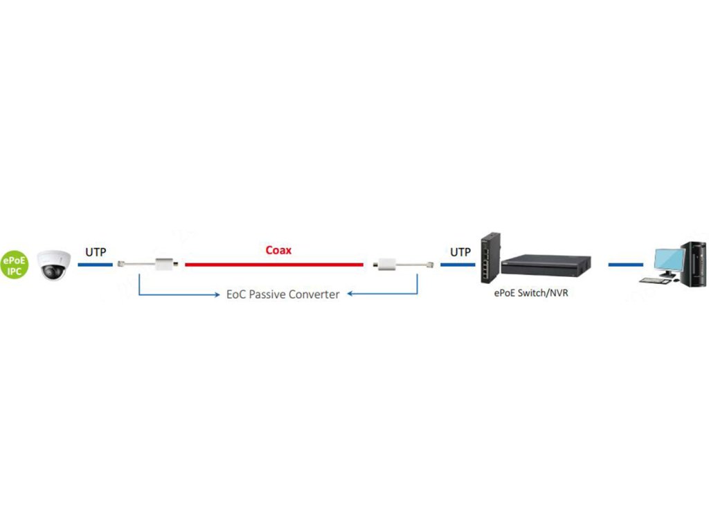 Pri migrácii analógových dohľadových systémov na sieťový systém IP môže opätovné použitie existujúceho koaxiálneho kábla výrazne znížiť náklady na inštaláciu . Použitie existujúcich káblov musí vyriešiť 3 problémy: IP videosignál a pripojenie RJ45 sa musia konvertovať, aby boli kompatibilné s koaxiálnym káblom, systém musí podporovať celú dĺžku koaxiálnych káblov a napájanie sa musí prenášať cez koaxiálny kábel. Systém Dahua ePoE IP rieši všetky tieto problémy a uľahčuje opätovné použitie existujúceho koaxiálneho kábla v systéme IP videa.