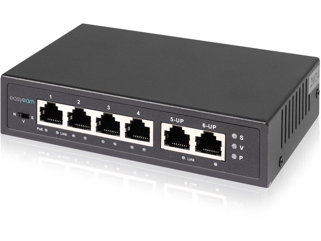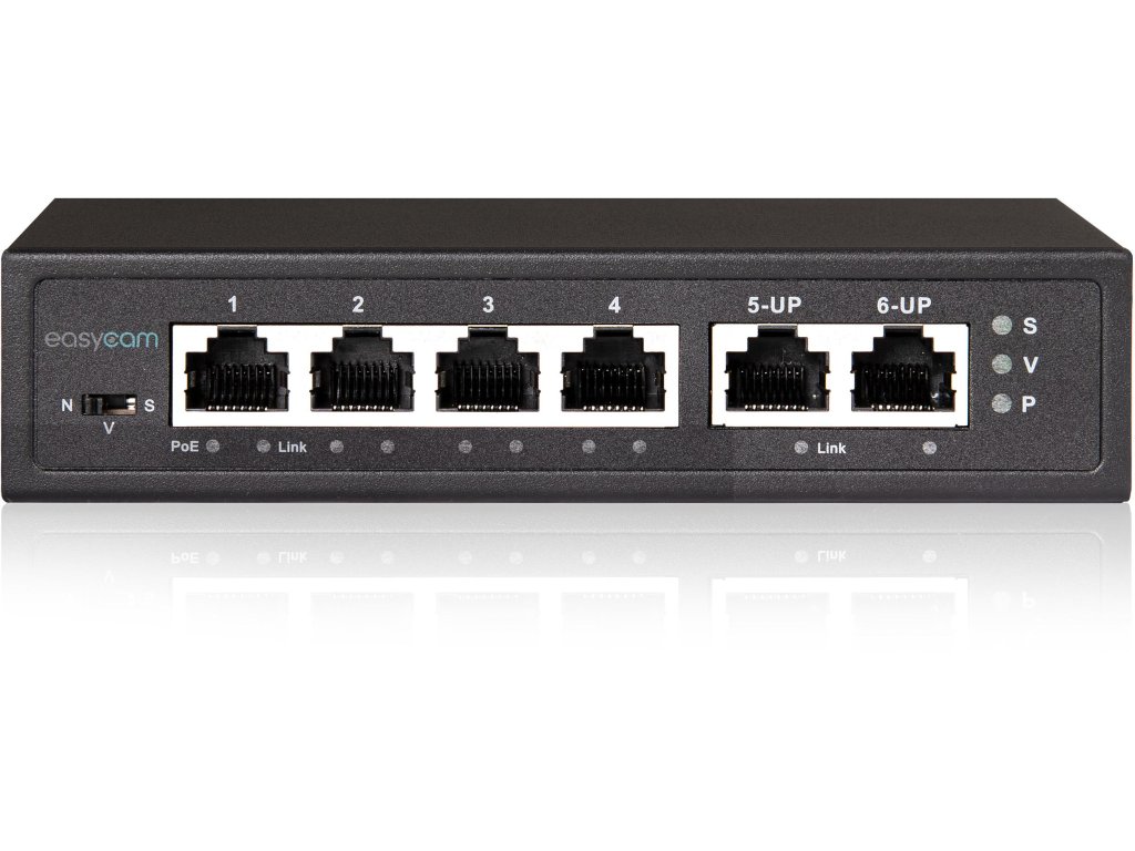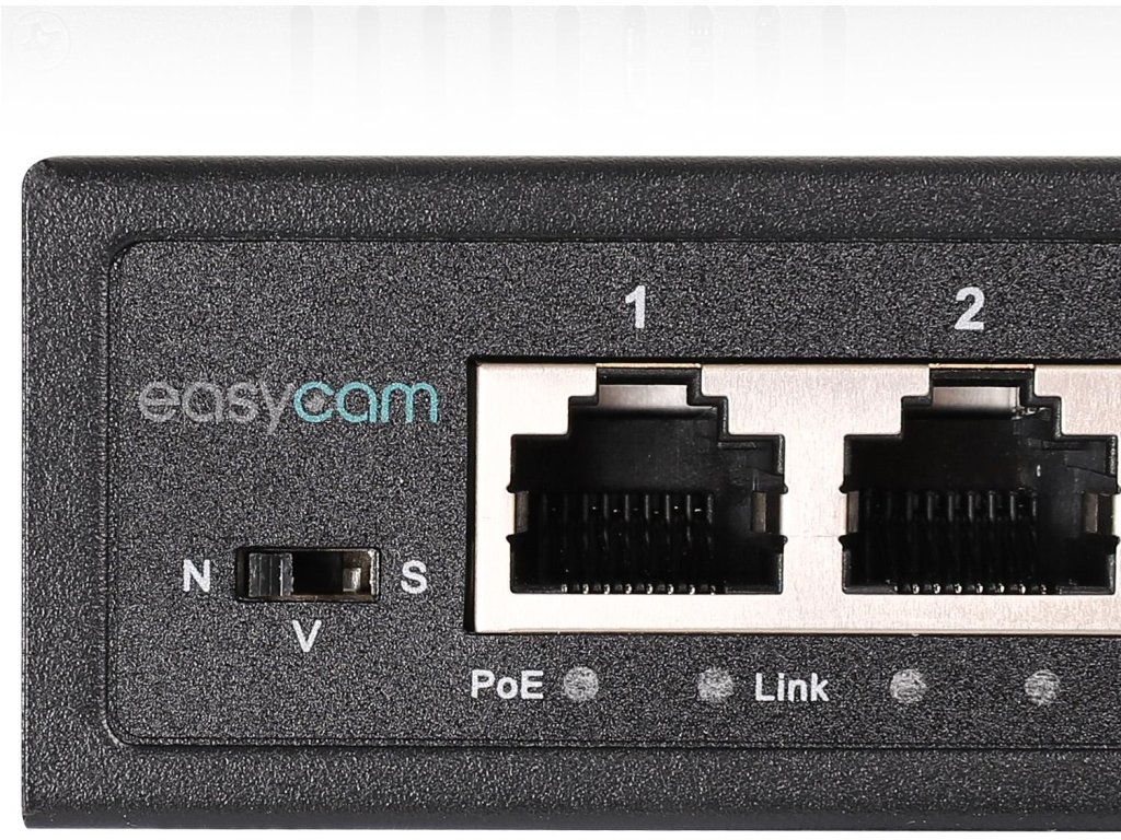 EasyCam PoE Switch je kompaktné, ale vysoko funkčné zariadenie, ktoré predstavuje ideálne riešenie pre systémy videodohľadu aj pre rozšírenie sieťovej infraštruktúry IKT. Vďaka 4 portom PoE (10/100 Mb/s) a 2 uplink portom poskytuje efektívny prenos dát a napájanie sieťových zariadení súčasne, čím eliminuje potrebu ďalších napájacích zdrojov.