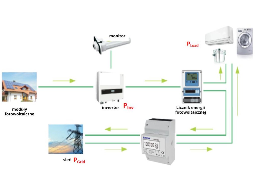 - Model vybavený možnosťamiresetovanie displeja meranie kombinovaného príkonu a výkonu aktívnej energie (kWh), energie stiahnuté z importnej siete (kWh) avyvezenej energie (fotovoltaika) (kWh).