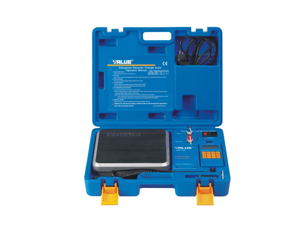 Elektronická váha používaná pri servise chladiacich a klimatizačných systémov.