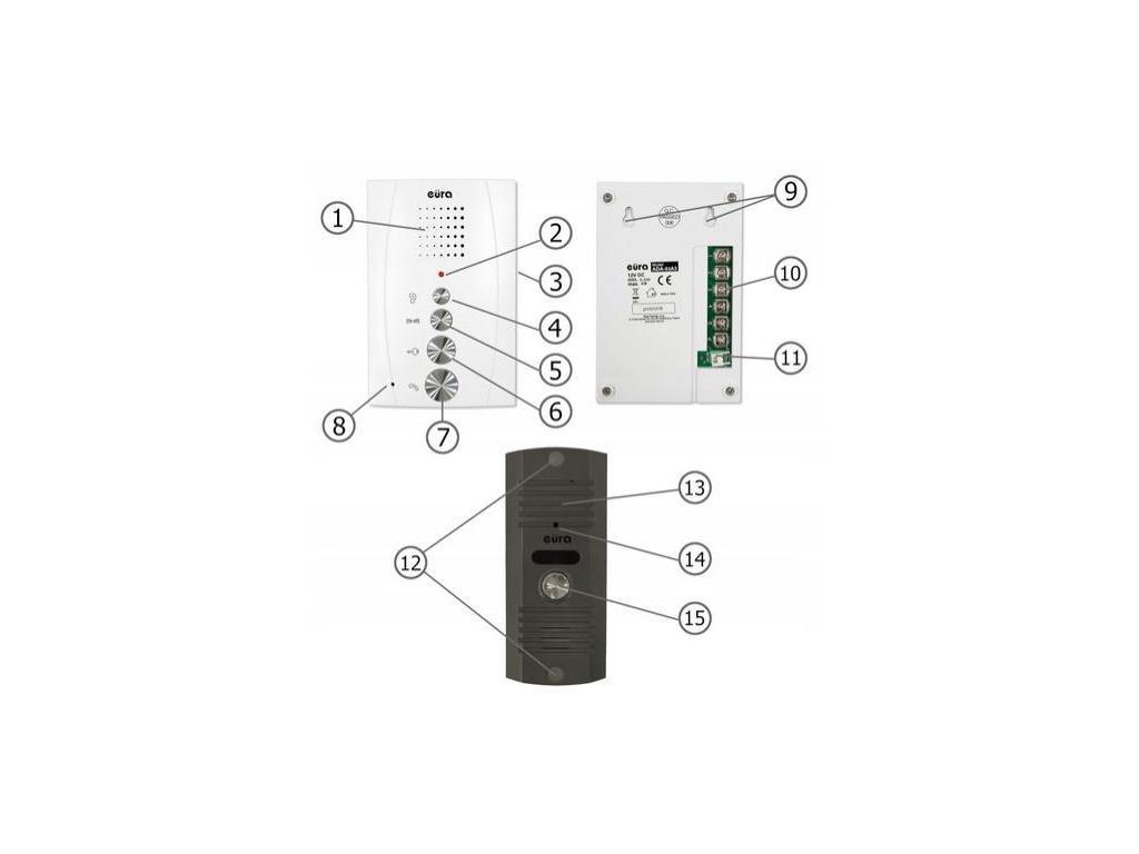 Súprava interkomu - Eura ADP-51A3 Difesa, vybavená dvoma bielymi hands-free unifónmi, malým vonkajšia kazeta a  napájanie 12 V DC .