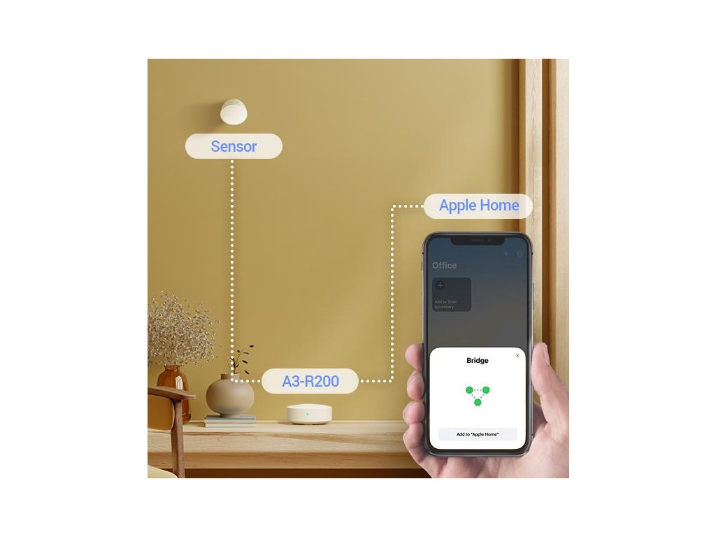 A3-R200 je prvé zariadenie, ktoré umožňuje komunikáciu a spoluprácu snímačov EZVIZ¹ s inteligentnými domácimi zariadeniami pomocou Apple Home. Pomocou zariadení Apple môže používateľ kontrolovať stav zariadení a rozhodovať o ich činnosti.