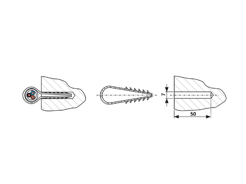 Priemer montážneho otvoru by sa mal zvoliť podľa vlastností materiálu podkladu. Ak sú uvedené dva priemery, pre tvrdší podkladový materiál a väčšiu veľkosť kábla by sa mal použiť väčší priemer.