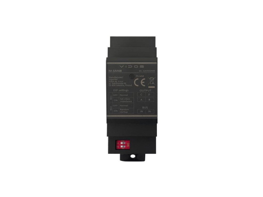 Okrem toho modul M-SM4B umožňuje distribúciu signálu v inštaláciách s viacerými monitormi alebo dverovými stanicami. Je vybavený 4 nezávislými vstupmi/výstupmi, ku ktorým možno pripojiť až 4 dverové stanice alebo 4 monitory. Príkladom praktického použitia je schodisko vo viacpodlažnej budove, kde sú na každom poschodí 3 - 4 byty.