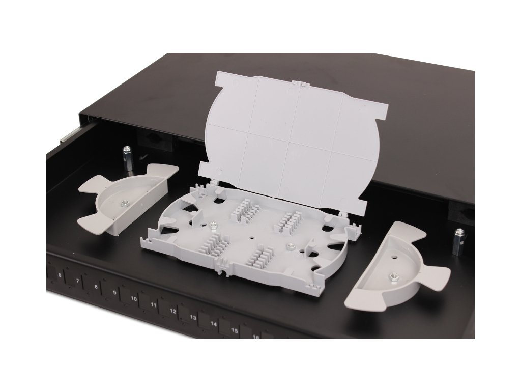 19" 24x SC Simplex 1U prepínač optických vlákien so štyrmi vývodkami PG 13,5 v balení. Prepínač má 24 portov pre optické adaptéry a umožňuje ukončenie až 24 optických vlákien. Je prispôsobený na inštaláciu do 19" stojana a je vybavený výsuvnou a vyberateľnou zásuvkou na pohodlný prístup do vnútra. Zásuvka má rebrá na pripevnenie káblových pások