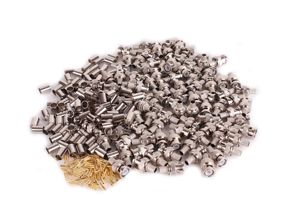 Monolitický konektor BNC z poniklovanej mosadze. Typ použitého materiálu zaručuje absenciu korózie. Najvyššia presnosť výroby ovplyvňuje vzhľad a kvalitu spojenia. Správne krimpovanie je veľmi jednoduché a zaručuje správne a stabilné spojenie na dlhú dobu. Spojka má dva plné (360°) krúžky, ktoré sa v dôsledku procesu stláčania spojky (pozdĺžne, axiálne stlačenie) vydúvajú dovnútra. Rozmery týchto krúžkov sú také, aby po stlačení konektora zvierali pneumatiku kábla dostatočne veľkou silou, ktorá znemožňuje odpojenie konektora od kábla, a dostatočne malou, aby nepoškodili konštrukciu kábla.