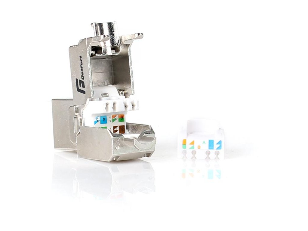 Beznástrojový modul Keystone je určený na konštrukciu tienených účastníckych zásuviek a patchpointov CAT6. Montáž umožňuje jednoduchú inštaláciu do patch panelov aj nástenných krabíc. Na druhej strane tvar krytu zabezpečuje minimálne odizolovanie káblov a uľahčuje inštaláciu. Konektory zásuviek sú označené farebným kódom, aby sa uľahčila správna inštalácia kabeláže. Krimpovanie kábla v module sa vykonáva bez použitia náradia alebo pomocou špeciálneho rázového nástroja, ktorý je tiež k dispozícii v našom sortimente. Západka namontovaná na konektoroch so štrbinami zabraňuje samovoľnému uvoľneniu káblov.