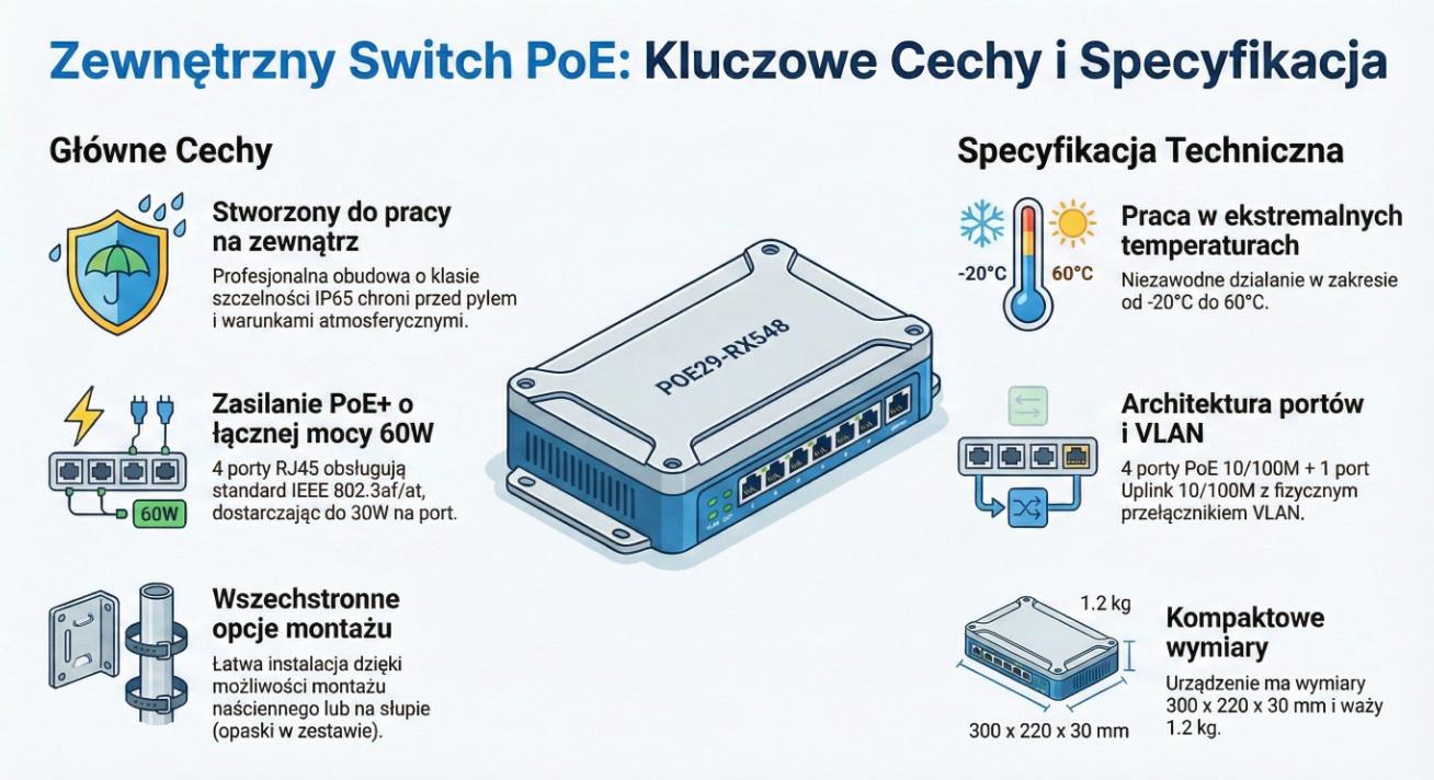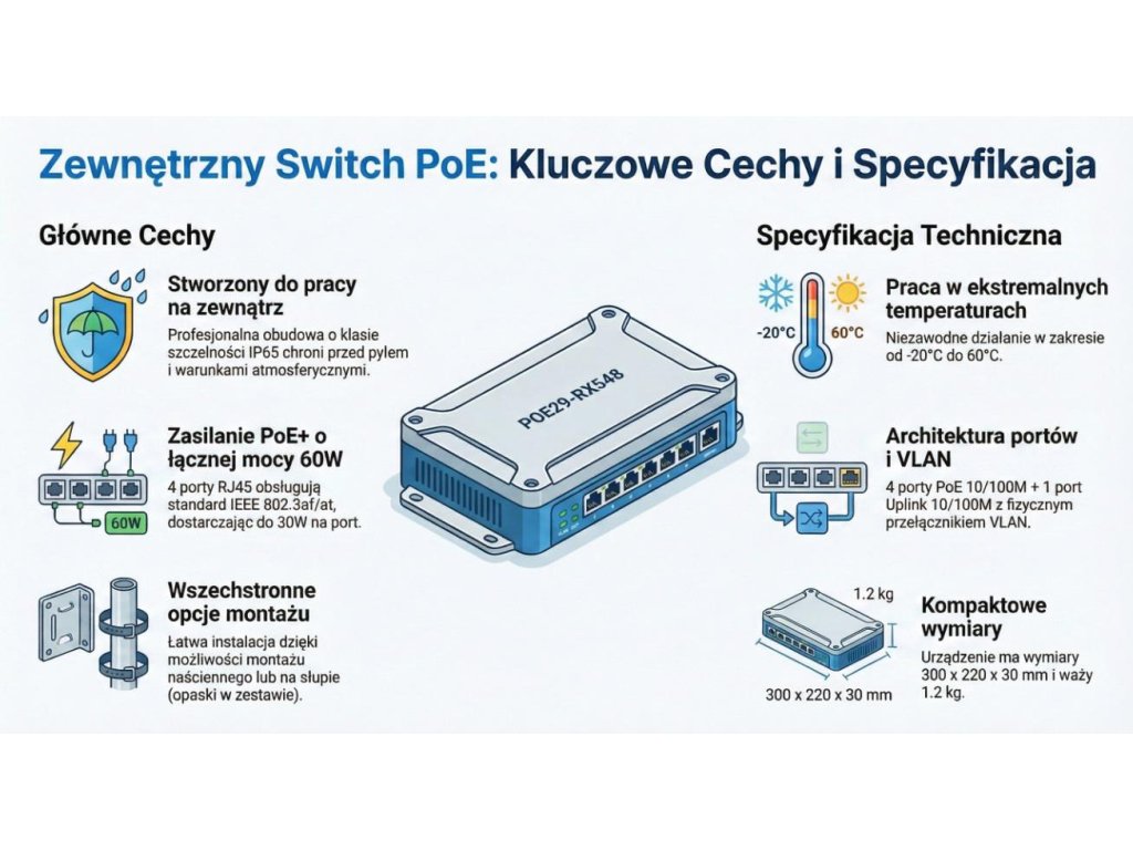 | Porty RJ45 | 5 × 10/100 Mb/s RJ45 (porty 1-4 PoE, port 5 uplink) |