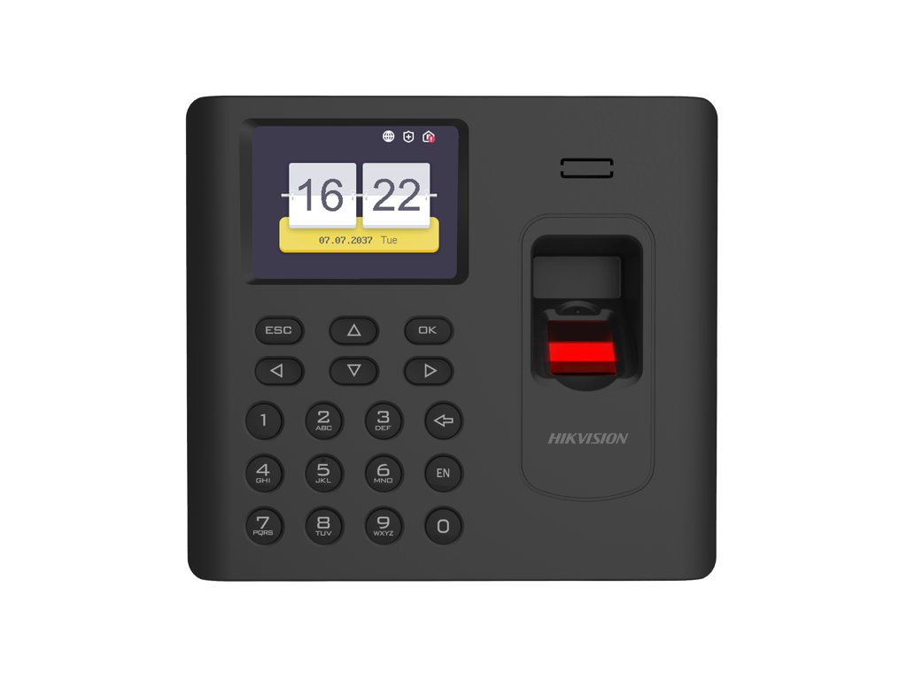 Záznamník času a dochádzky DS-K1A802AMF-B je samostatné zariadenie s klávesnicou, čítačkou RFID a čítačkou odtlačkov prstov.
