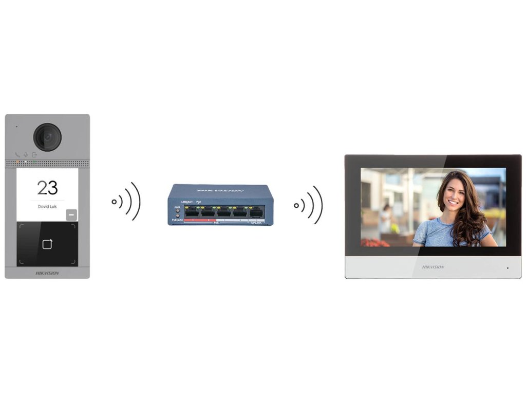 - Videointerkomová súprava DS-KIS604-S(B) sa skladá z dverovej stanice DS-KV8113-WME1 , monitor DS-KH6320-WTE1 prepínač PoE DS-3E0105P-E/M(B) a karty microSD 16 GB .