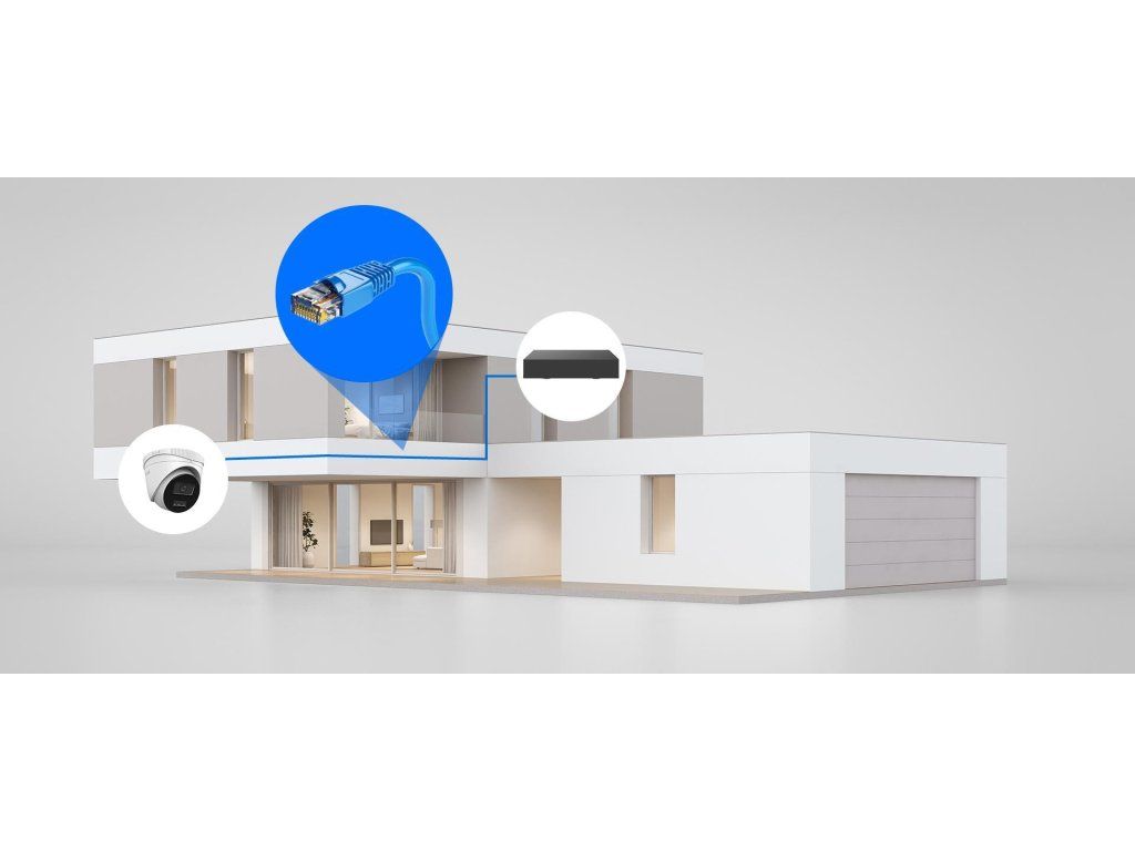 - łatwiejszy montaż – mniej okablowania i brak potrzeby dodatkowego zasilacza przy kamerze