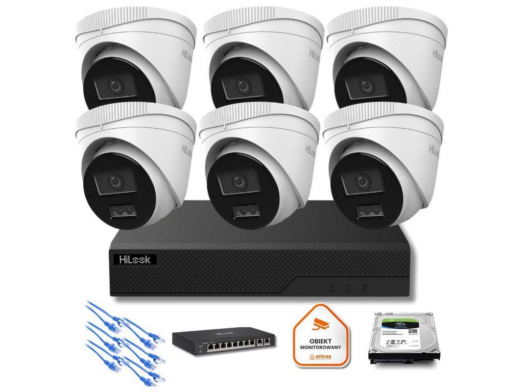 Zestaw monitoringu IP HiLook 8MP – 6x kamera IPC-T280HA-LU + NVR 8CH + dysk 2TB | 4K | Smart Hybrid Light | PoE