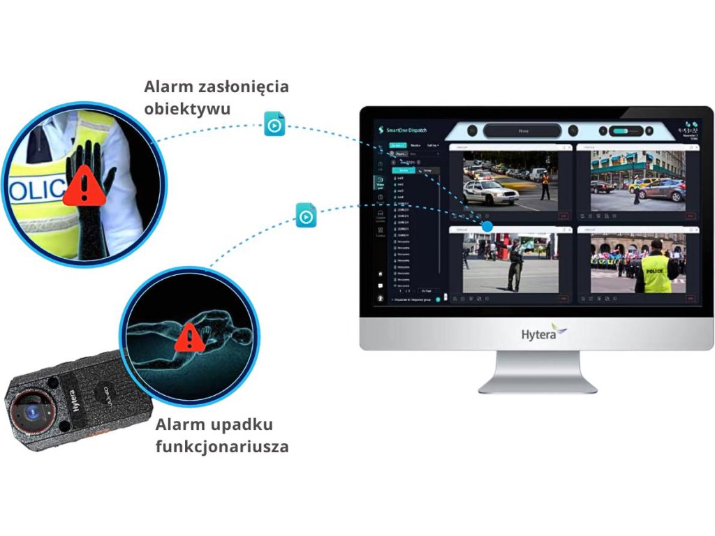 - Situačná detekcia - automaticky zistí, či je objektív zakrytý alebo či dôstojník spadne, a vyšle alarm.