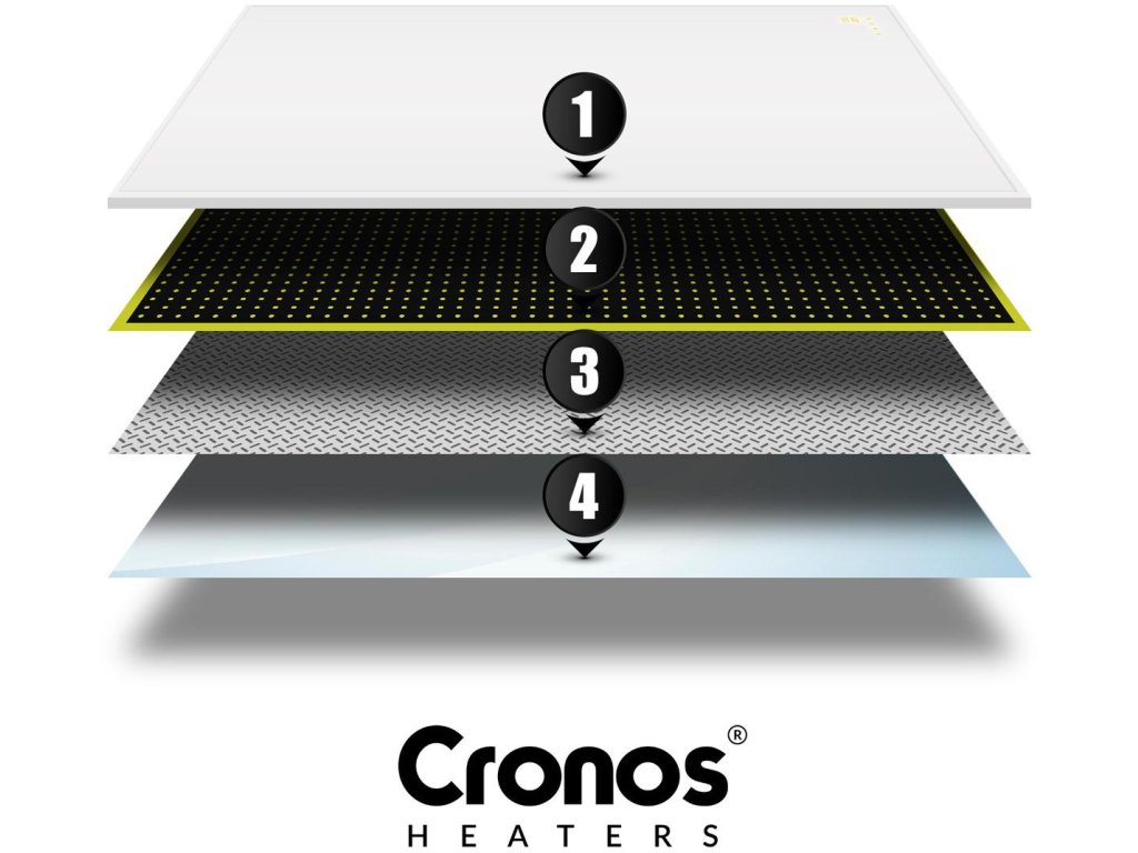 Ultratenký infračervený ohrievač od spoločnosti CRONOS® umožňuje vyhrievanie miestnosti pomocou infračerveného žiarenia, takže zvýšenie teploty ovplyvňuje len živé organizmy a predmety. Žiarenie neohrieva vzduch, čo prospieva zdraviu alergikov a astmatikov.
