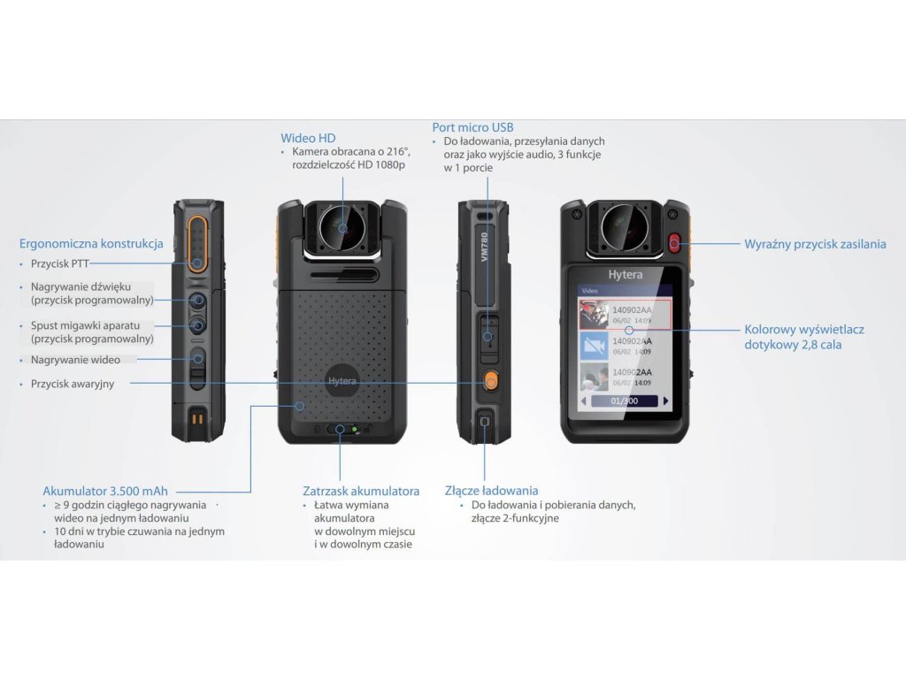 Objektív prednej kamery zariadenia Hytera VM780 možno vertikálne otáčať o 216°, čo poskytuje optimálny uhol pohľadu a umožňuje zaznamenávať kritické udalosti bez ohľadu na to, kde je kamera namontovaná.