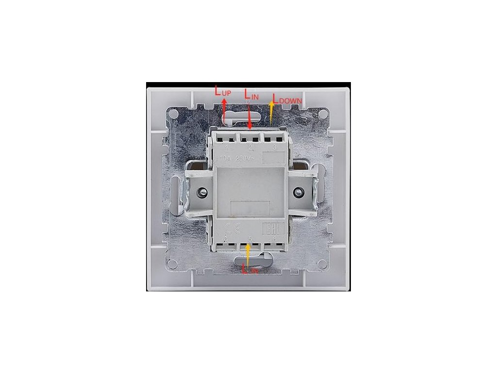 Pripojte spoločne prívodné vodiče N z rozvodnej skrinky (zo steny) a motor N žalúzie, podobne pripojte spoločne vodiče PE. Pripojte fázový vodič 240 V L k svorke 2 spínača.