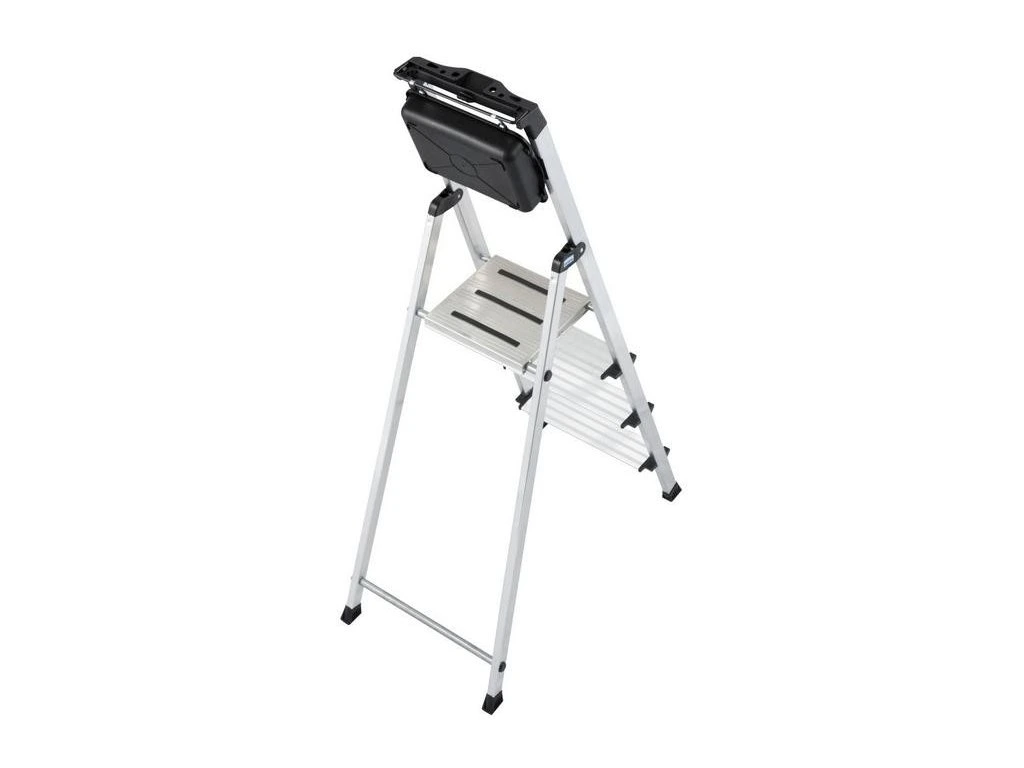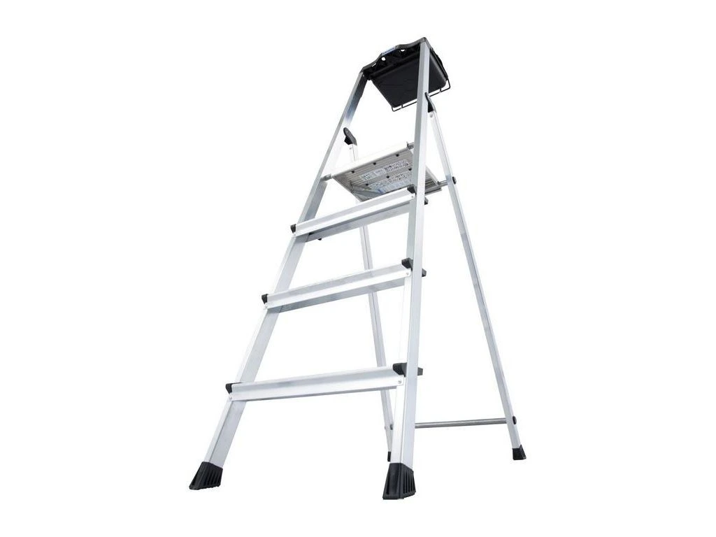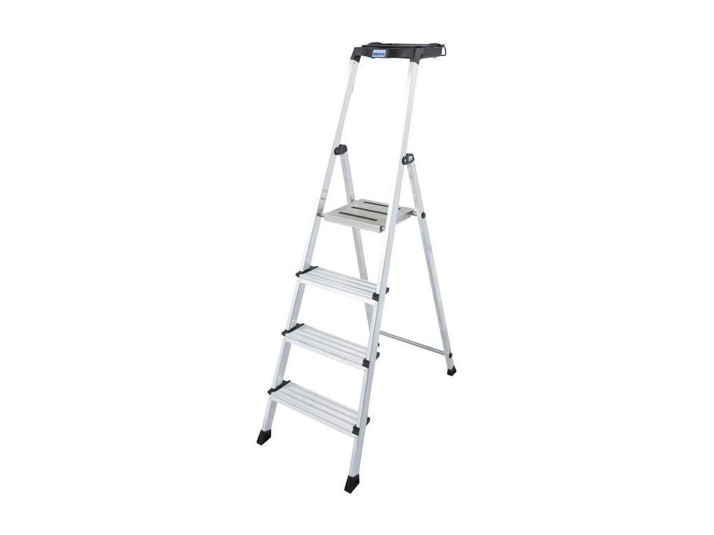 Praktický a všestranný voľne stojaci hliníkový rebrík s protišmykovou plošinou a veľkou funkčnou policou na náradie a špeciálnym držiakom na vedro.