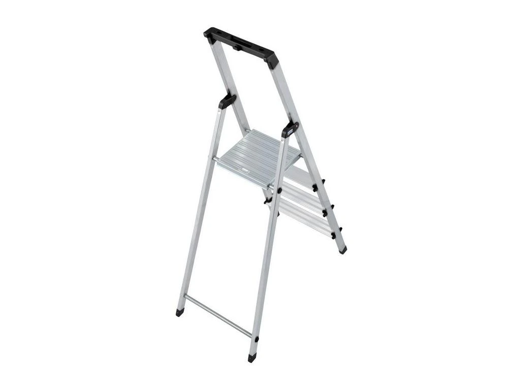 Robustný a praktický hliníkový rebrík s malou policou na náradie a držiakmi na vedrá určený na prácu v interiéri.