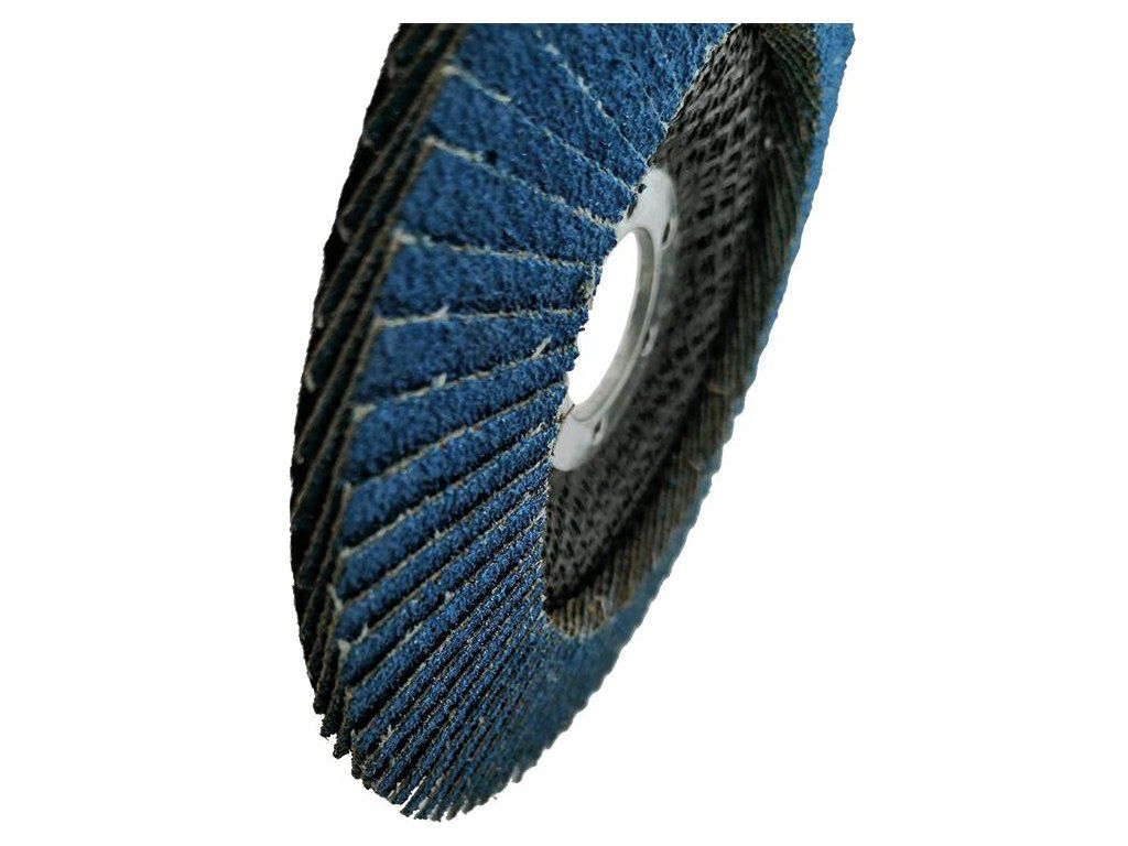 Vysokokvalitný disk s chlopňouohnuté s priemerom 125 mm a zrnitosťou 60 mm so zirkóniovým povlakom na obrábanie nehrdzavejúcej ocele. Zrno má samoostriace vlastnosti pre dlhú životnosť. Je ideálny na agresívne a ťažké práce. Môže sa použiť na obrábanie ocele, ale dosahuje sa nižší výkon.