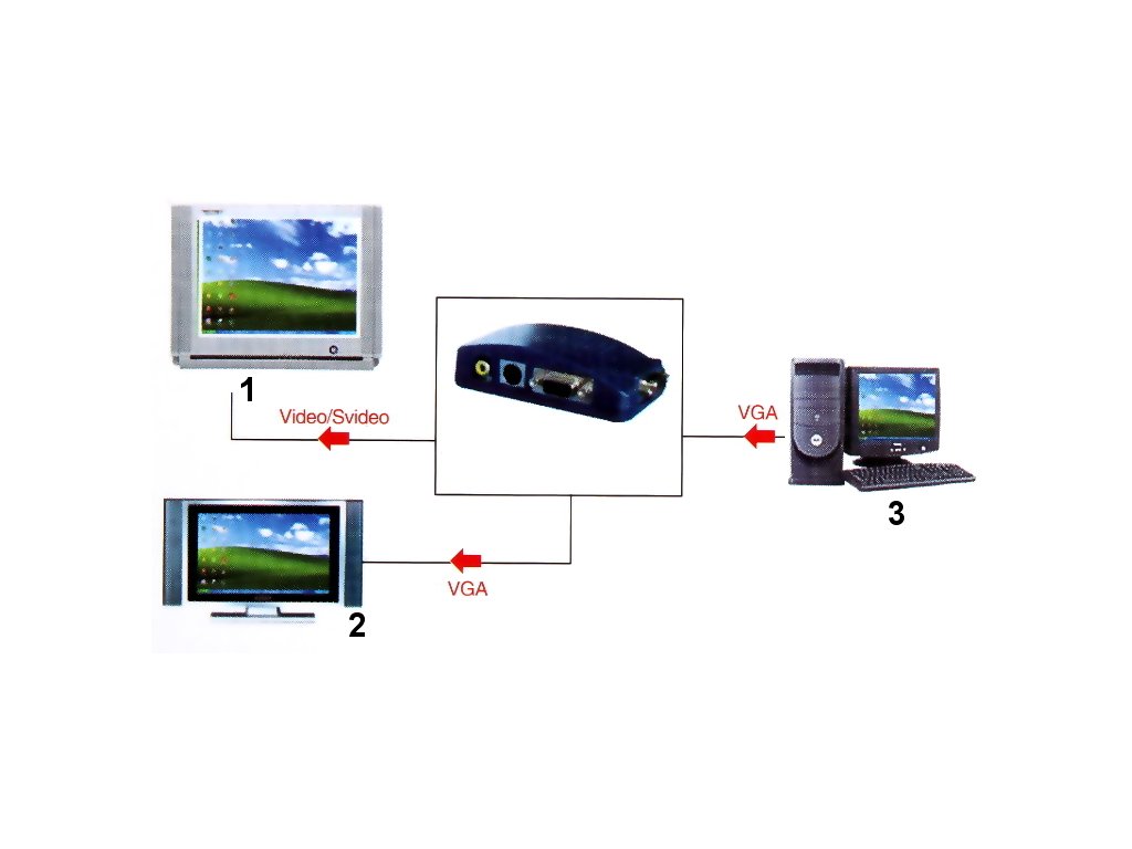 Konvertor umožňuje pripojenie signálu VGA (napr. z videorekordéra alebo počítača) k bežnému monitoru alebo projektoru so vstupom AV (kompozitný video signál) alebo so vstupom S-Video. Pomocou adaptéra je možné pripojiť videosignál z DVR vybaveného konektorom VGA k monitoru vybavenému iba konektorom BNC.