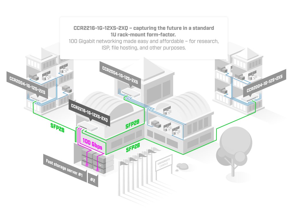 MikroTik Cloud Core Router CCR2216-1G-12XS-2XQ ide o najnovší vlajkový router s procesorom Amazon Annapurna Labs Alpine v3 AL73400 so 16 jadrami taktovanými na 2 GHz. Na plné využitie tohto výkonu má 12x sloty SFP28 25 Gb/s, 2x 100Gb/s sloty QSFP28, 1x gigabitový ethernetový port a 2x sloty M.2 SATA pre ďalšiu pamäť.