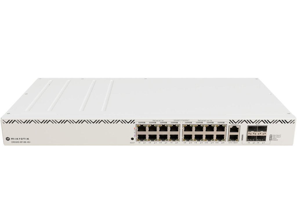 Prepínač CRS320-8P-8B-4S+RM je vybavený 17x gigabitovými ethernetovými portmi, gigabitovým ethernetovým portom na správu, konzolovým portom RJ45 a 4x 10G SFP+ slotmi na uplink. Ethernetové porty 1 - 8 majú výstup napájania PoE+ (802.3af/at) a porty 9 - 16 majú výstup napájania PoE++ (802.3af/at/bt), spolu 16 portov s PoE. Výkon na port je v závislosti od štandardu 15,4 W pri 802.3af, 30 W pri 802.3at alebo 60 W pri 802.3bt.