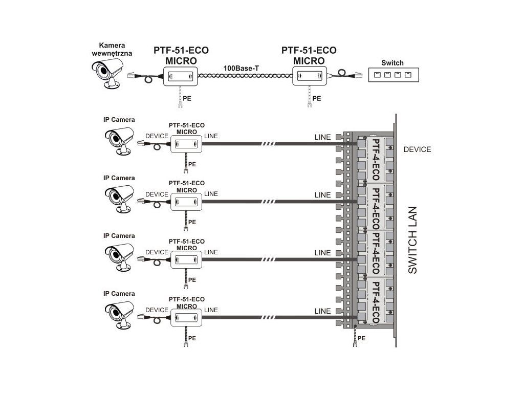 PTF-51-ECO/PoE/Micro/T v2 je miniatúrny zvodič prepätia určený pre siete LAN 100-BaseT založené na kábloch UTP kategórie 5 alebo 6. Malé rozmery a zabudovaný kábel so zástrčkou umožňujú rýchlu a jednoduchú inštaláciu a ukrytie zariadenia v malých skriniach. Je ideálny na ochranu IP CCTV kamier vybavených originálnymi základňami skrývajúcimi príslušenstvo a akékoľvek pripojenia. Zvodič chráni pred prepätím a úderom blesku, ako aj pred činmi vandalizmu (účinky paralyzérov). Možno ho použiť na ochranu sietí LAN vo vnútri budov, ochranu koncových zariadení a prepínačov alebo rádiových mostíkov. Zariadenie individuálne chráni každý prenosový pár, pričom prepätia nad 3,5 V v rámci nich sú eliminované.
