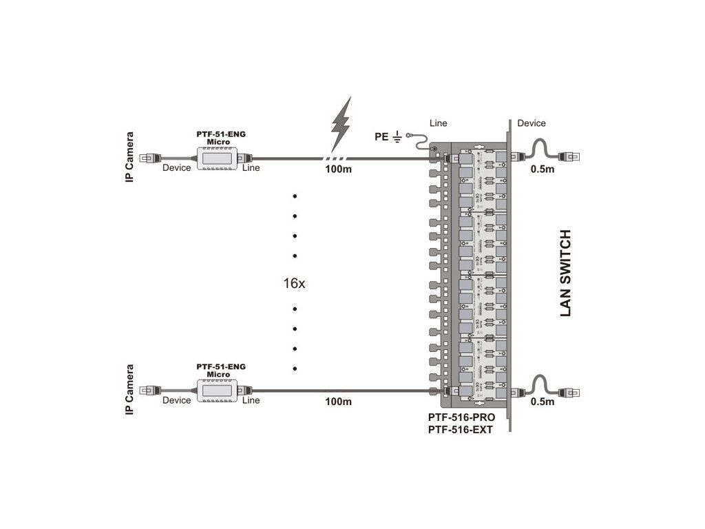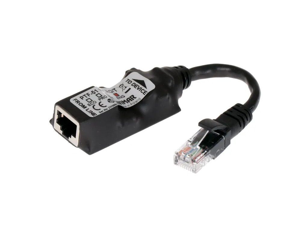 PTF-51-ENG/PoE/Micro/T je nový miniatúrny zvodič prepätia využívajúci riešenie Extreme No Ground. Je určený na ochranu sietí LAN, kde je problém so zemniacim vedením PE k jednotlivým kamerovým bodom alebo iným koncovým zariadeniam LAN. Zariadenie možno použiť na ochranu externých kamier, ale ochrana sa obmedzí len na elimináciu malého elektromagnetického impulzu indukovaného v kábli LAN. Funguje so sieťami LAN 10-BaseT a 100-BaseT založenými na kábloch UTP kategórie 5 alebo 6.