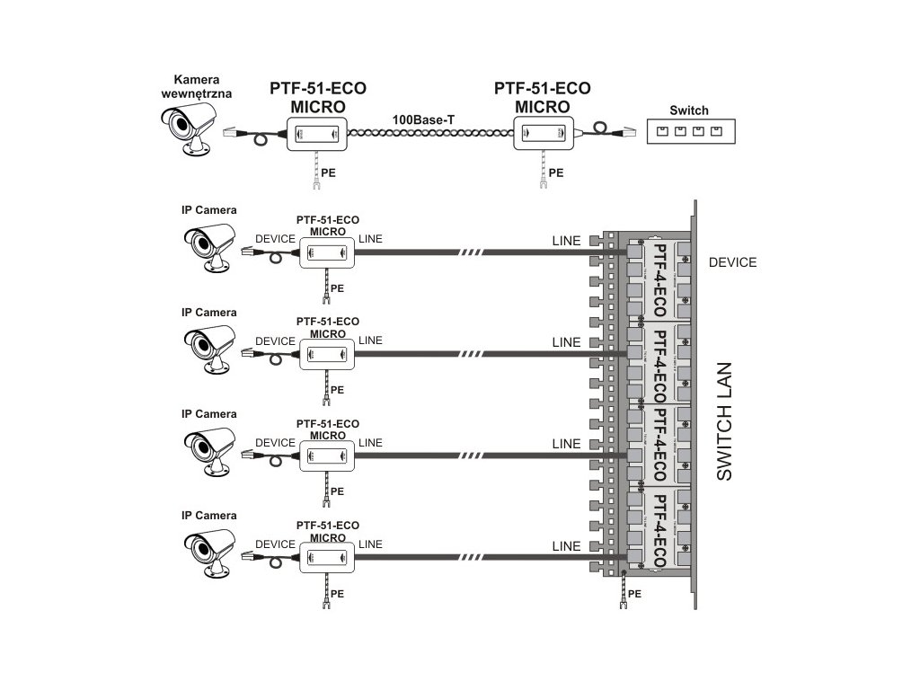PTF-51-ECO/PoE/Micro je miniatúrny zvodič prepätia určený pre 100-BaseT LAN založené na UTP kábloch kategórie 5 alebo 6. Malé rozmery a zabudovaný kábel s konektorom umožňujú rýchlu a jednoduchú inštaláciu a skrytie zariadenia v malých skriniach. Je ideálny na ochranu kamier IP CCTV vybavených originálnymi základňami, ktoré ukrývajú príslušenstvo a všetky pripojenia. Zvodič chráni pred prepätím a bleskom, ako aj pred vandalizmom (účinky paralyzérov). Môže sa použiť na ochranu sietí LAN vo vnútri budov, ochranu koncových zariadení a prepínačov alebo rádiových mostov. Zariadenie individuálne chráni každý prenosový pár, pričom prepätia nad 6 V v nich sú eliminované