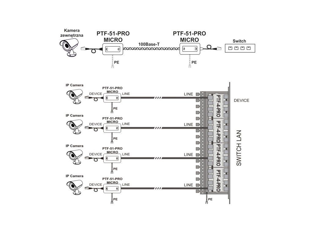 PTF-51-PRO/PoE/Micro/T v2 je miniatúrny zvodič prepätia určený pre siete LAN 100-BaseT založené na kábloch UTP kategórie 5 alebo 6. Malé rozmery a zabudovaný kábel s konektorom umožňujú rýchlu a jednoduchú inštaláciu a ukrytie zariadenia v malých skriniach. Je ideálny na ochranu kamier IP CCTV vybavených originálnymi základňami skrývajúcimi príslušenstvo a akékoľvek pripojenia. Zvodič chráni pred prepätím a úderom blesku, ako aj pred činmi vandalizmu (účinky paralyzérov). Zariadenie individuálne chráni každý prenosový pár, pričom prepätia nad 3,5 V v nich sú eliminované, a odvádza náboje až do 2,5 kA na jeden vodič do zeme.