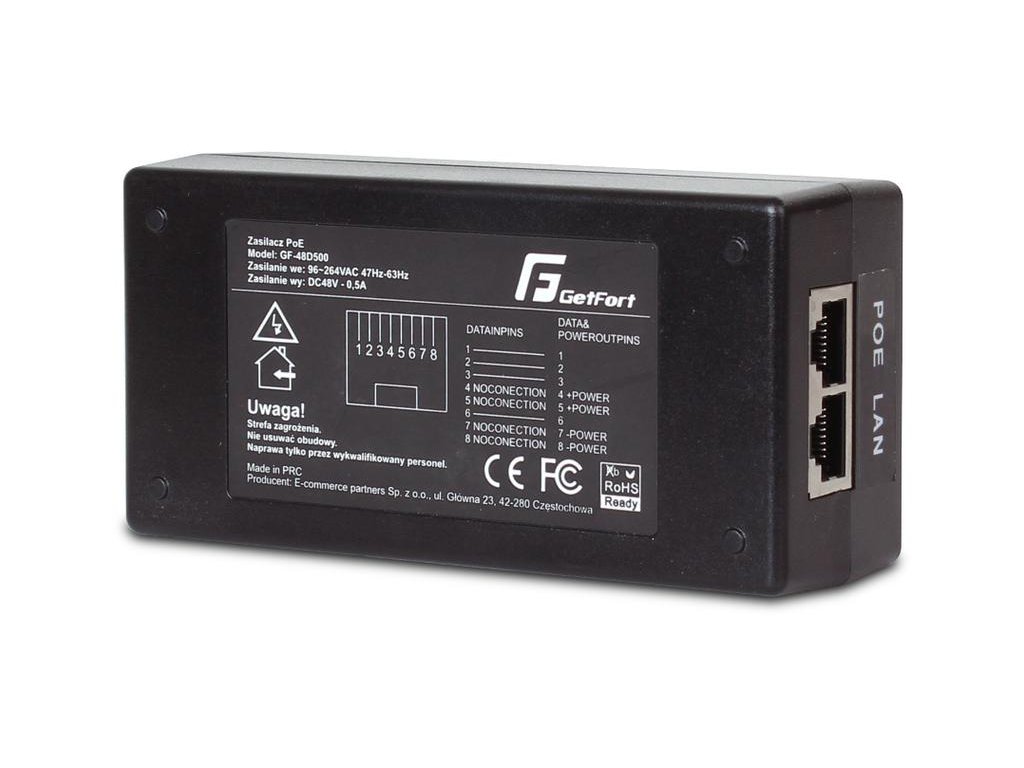 GetFort Adaptér PoE; je sieťový prvok s ktorým je možné prenášať napájanie cez vybrané vodiče sieťového kábla do zariadení vyžadujúcich  48 V DC .