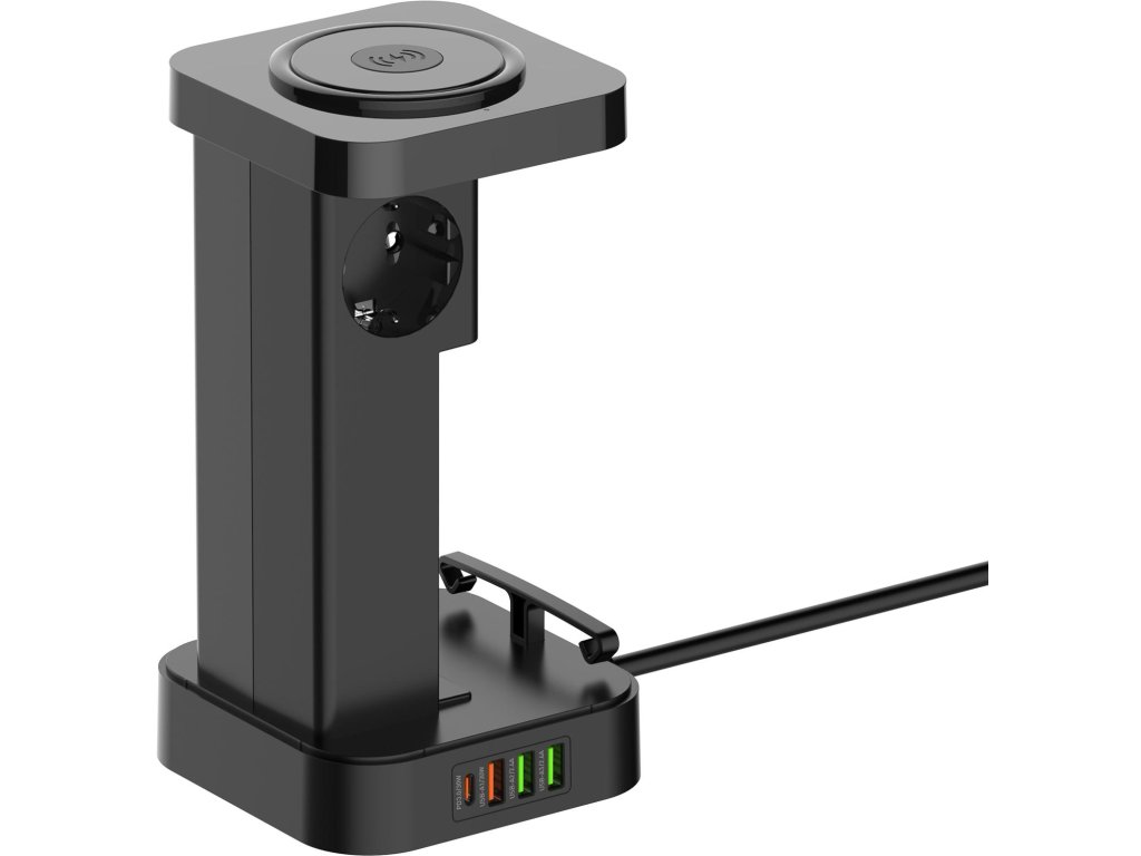 Newell GaN Power Cube 8v1 je viac ako len jednoduchý rozdeľovač - je to premyslene navrhnuté a štýlové centrum napájania, ktoré harmonicky zapadne do vášho interiéru. Po zapojení vašich zariadení do zásuviek sú všetky káble vyvedené von zadnou stranou cez špeciálny otvor a celé je to chránené odnímateľným elegantným krytom. Zástrčky zmiznú z dohľadu a priestor získa uprataný, minimalistický vzhľad. Porty USB v spodnej časti zariadenia sú vždy po ruke. Vertikálny dizajn je doplnený indukčnou nabíjačkou, na ktorú stačí položiť kompatibilný smartfón alebo slúchadlá a začne sa nabíjať.