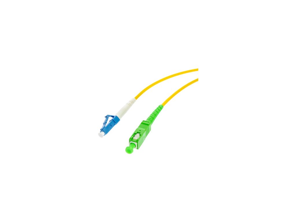 SIMPLEX optický patchcord s priemerom 3 mm, typ konektora SC/APC-LC/UPC. Patchcord umožňuje napríklad prepojenie optických portov v dátových komunikačných rozvádzačoch.