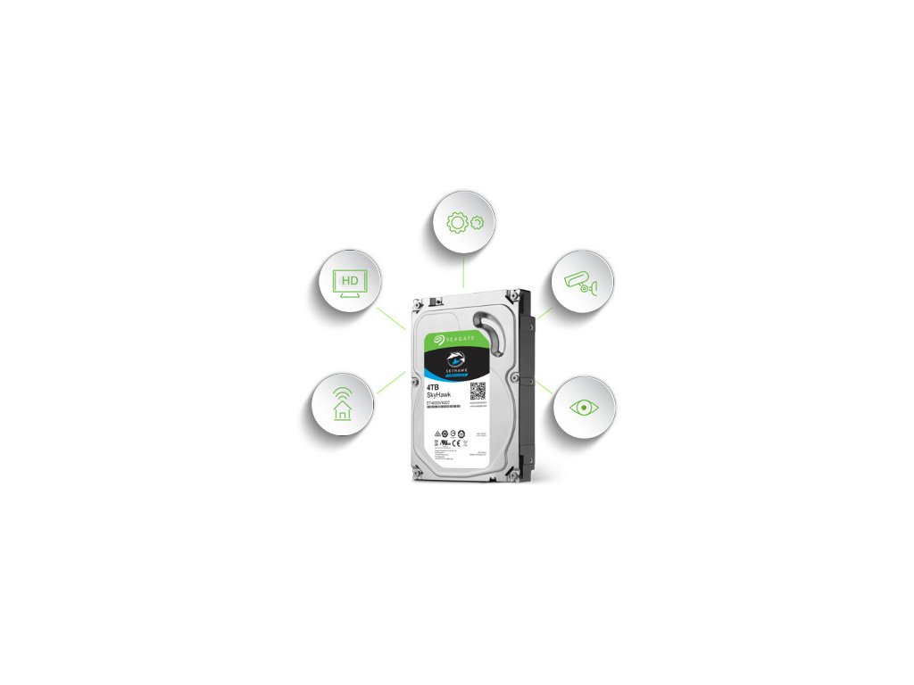- Disky SkyHawk™ sú vybavené vylepšeným firmvérom ImagePerfect™, ktorý pomáha minimalizovať stratu snímok a prestoje pri pracovnom zaťažení 3-krát vyššom ako u stolových diskov, a sú pripravené nahrávať až 90 % času, pričom podporujú až 64 HD kamier.