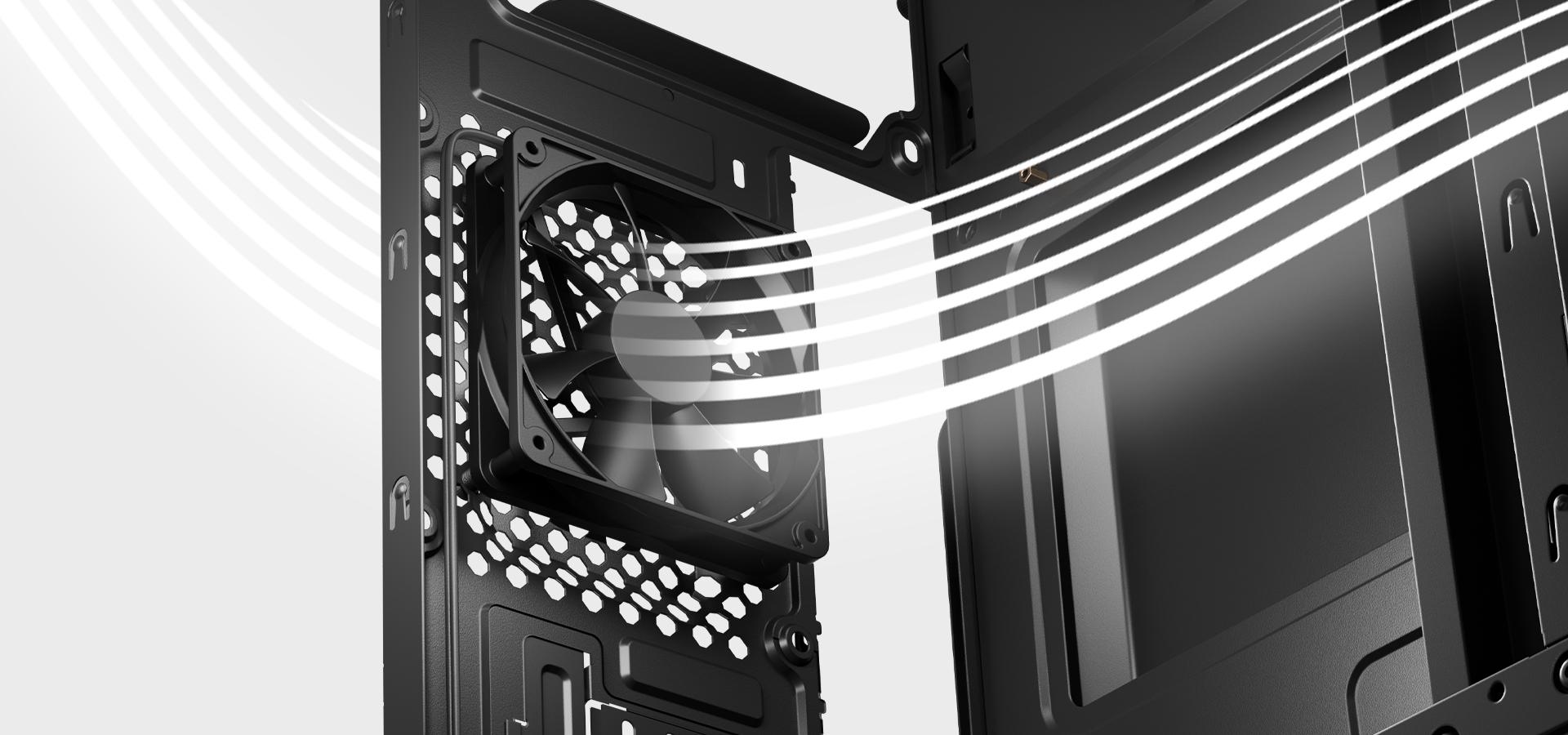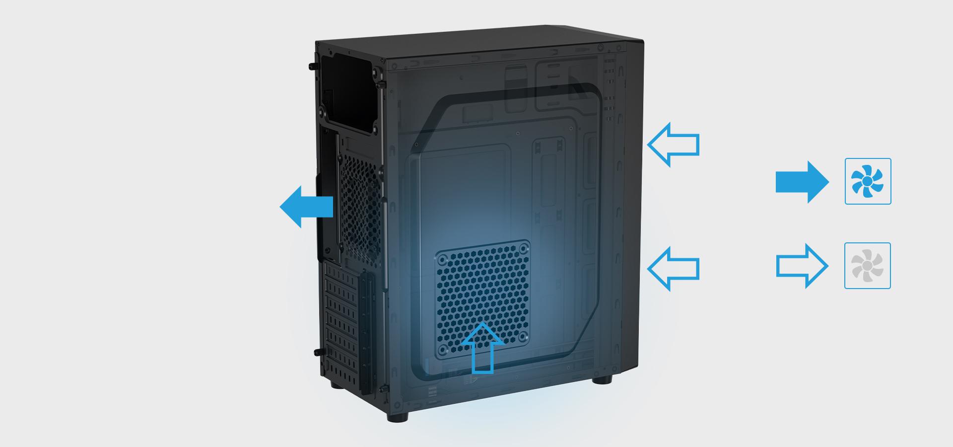 Vďaka vstavanému 80 mm ventilátoru s 3-pinovým konektorom a možnosti inštalácie ventilátorov rôznych veľkostí (80, 90 a 120 mm) na bočnej a zadnej strane, ako aj dvoch (120 mm) ventilátorov na prednej strane, poskytuje skriňa v tejto cenovej kategórii nevídanú všestrannosť montáže a tým aj cirkuláciu vzduchu. Prispôsobiteľný systém ventilácie vám poskytuje plnú kontrolu nad teplotou vášho počítača. Skriňa má navyše nožičky, ktoré umožňujú ešte lepšie prúdenie vzduchu zospodu.