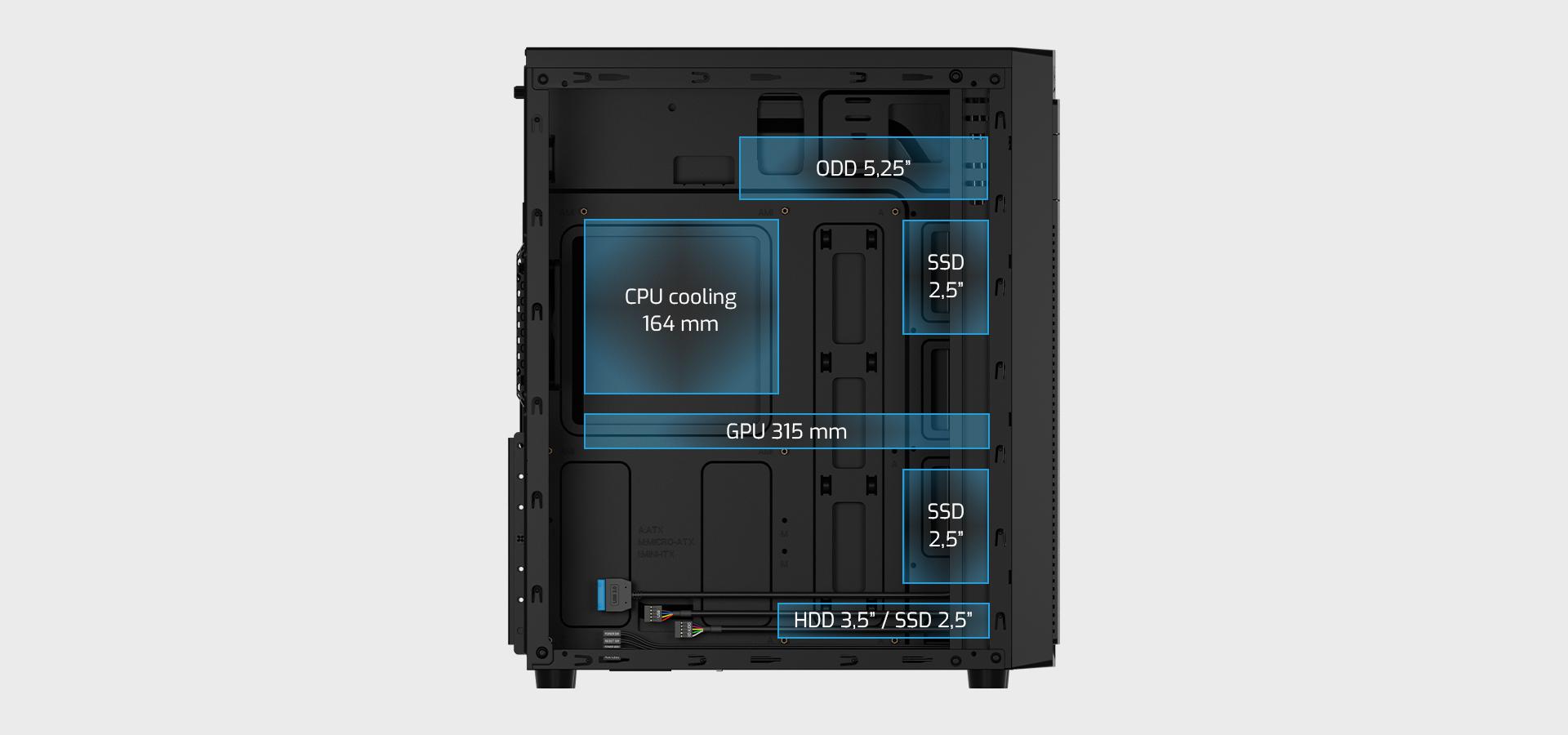 Vďaka trom 2,5" slotom pre disky SSD/HDD získate možnosť rozšíriť úložisko počítača, čím si zabezpečíte jednoduchý prístup k veľkým súborom a ich rýchlu výmenu. Skriňa vám pomôže udržať poriadok a organizáciu, aby ste mohli čo najlepšie využiť dostupný priestor.