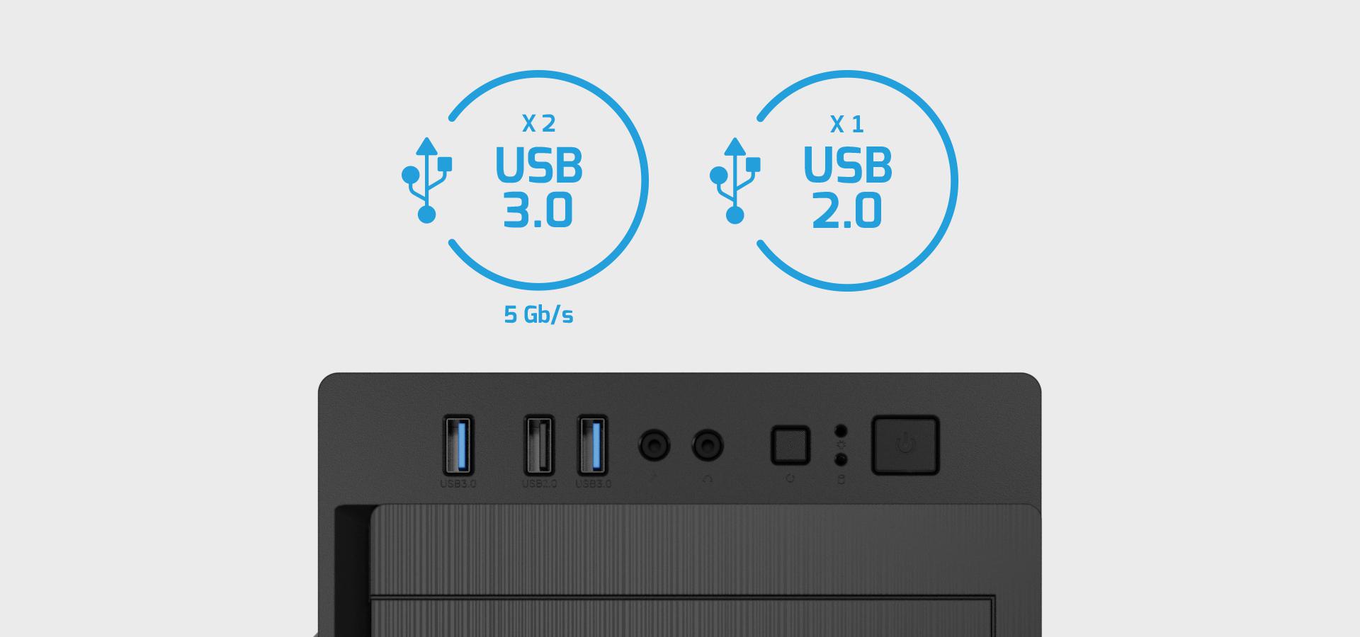 Skriňa je vybavená dvoma portami USB 3.0 (s rýchlosťou až 5 Gb/s) na prednej strane, ktoré vám umožnia pripojiť periférne zariadenia a prenášať veľké súbory v krátkom čase. Toto riešenie zaručuje pohodlie pri práci a šetrí váš drahocenný čas. Okrem toho - ak vám nezáleží na čase, ale chcete rýchlo pripojiť zariadenie - na skrini nájdete port 2.0, pre vaše úplné pohodlie.