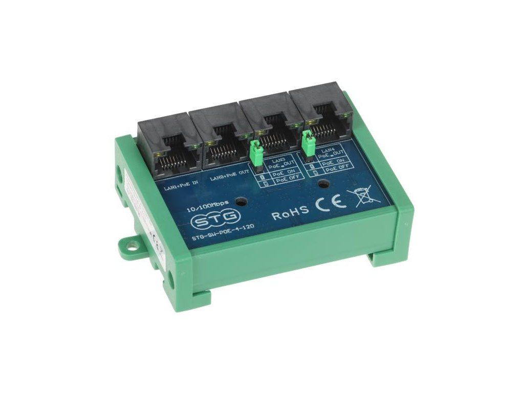 STG-SW-POE-4-120 bol navrhnutý ako extender LAN (rozširovač) a napájací zdroj PoE. Je navrhnutý na prácu s IP kamerami a inými sieťovými zariadeniami napájanými pomocou PoE 802.3at/af a PoE PASSIVE. Regeneruje sieťový signál a prenáša napájanie PoE na vybrané výstupy a jeho kompaktné rozmery poskytujú viac možností inštalácie - možno ho namontovať na štandardnú lištu DIN.