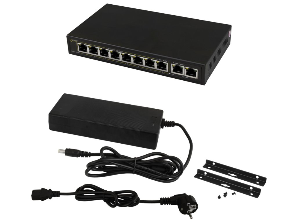 - 10-portový prepínač: 8 portov PoE 10/100/1000Mbps (dáta a napájanie), 2 porty 10/100/1000Mbps (UP LINK)