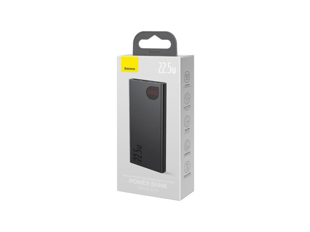 Powerbanka značky Baseus podporuje viacero štandardov rýchleho nabíjania vrátane SCP, Quick Charge 3.0, Power Delivery 3.0 a má 2 výstupné porty USB-A, vstupný/výstupný port USB-C a vstupné porty Lightning a Micro-USB. Produkt podporuje maximálny výstupný prúd 22,5 W. LED obrazovka na jeho kryte zobrazuje aktuálny prevádzkový prúd a úroveň nabitia batérií. IC podporuje množstvo bezpečnostných funkcií na ochranu pripojených zariadení pred poškodením.